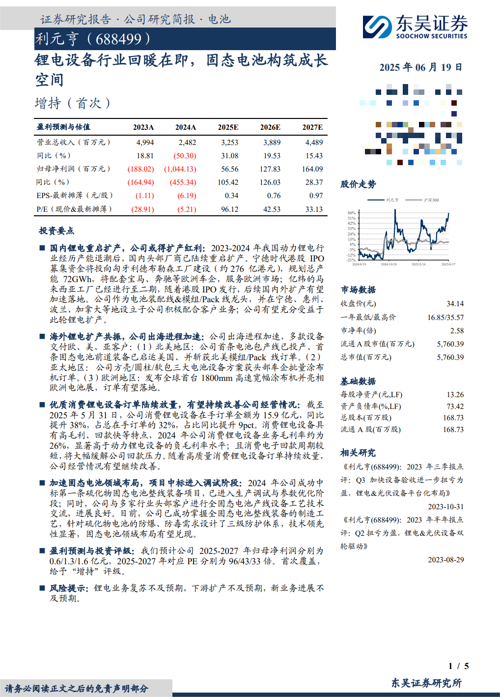 答:公司作为全固态电池整线解决方案服务商,依托超百项自主专利成功打通全线量产工艺,覆盖从各工段关键设备到整线方案,具备硫化物、氧化物、聚合物及卤化物全体系设备适配能力。当前向头部车企供应的全固态电池整线项目已开始陆续交付。同时,利元亨也持续利用在工艺端的深厚积累,不断优化干法设备、软包叠片、高压化成分容等核心单机设备,为多技术路线客户提供更契合其特定应用场景和产品需求的解决方案,积极推动固态电池的产业化进程。