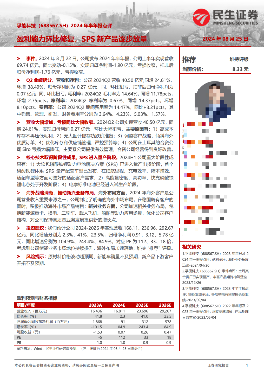 出货方面,公司目前半固态出货量已达GWh级别,半固态电池出货量占比较高。公司2023年后获得的三元体系产品定点均采用半固态解决方案,覆盖高端商用车、eVTOL等多领域头部客户,随着以上定点的陆续交付及第二代半固态电池的量产,公司半固态电池出货规模及占总出货量比例有望显著提升,有望进一步增厚利润空间。