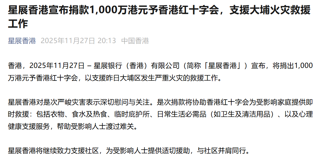 11月27日,星展银行(香港)有限公司(简称「星展香港」)宣布,将捐出1,000万港元予香港红十字会,以支援昨日大埔区发生严重火灾的救援工作。