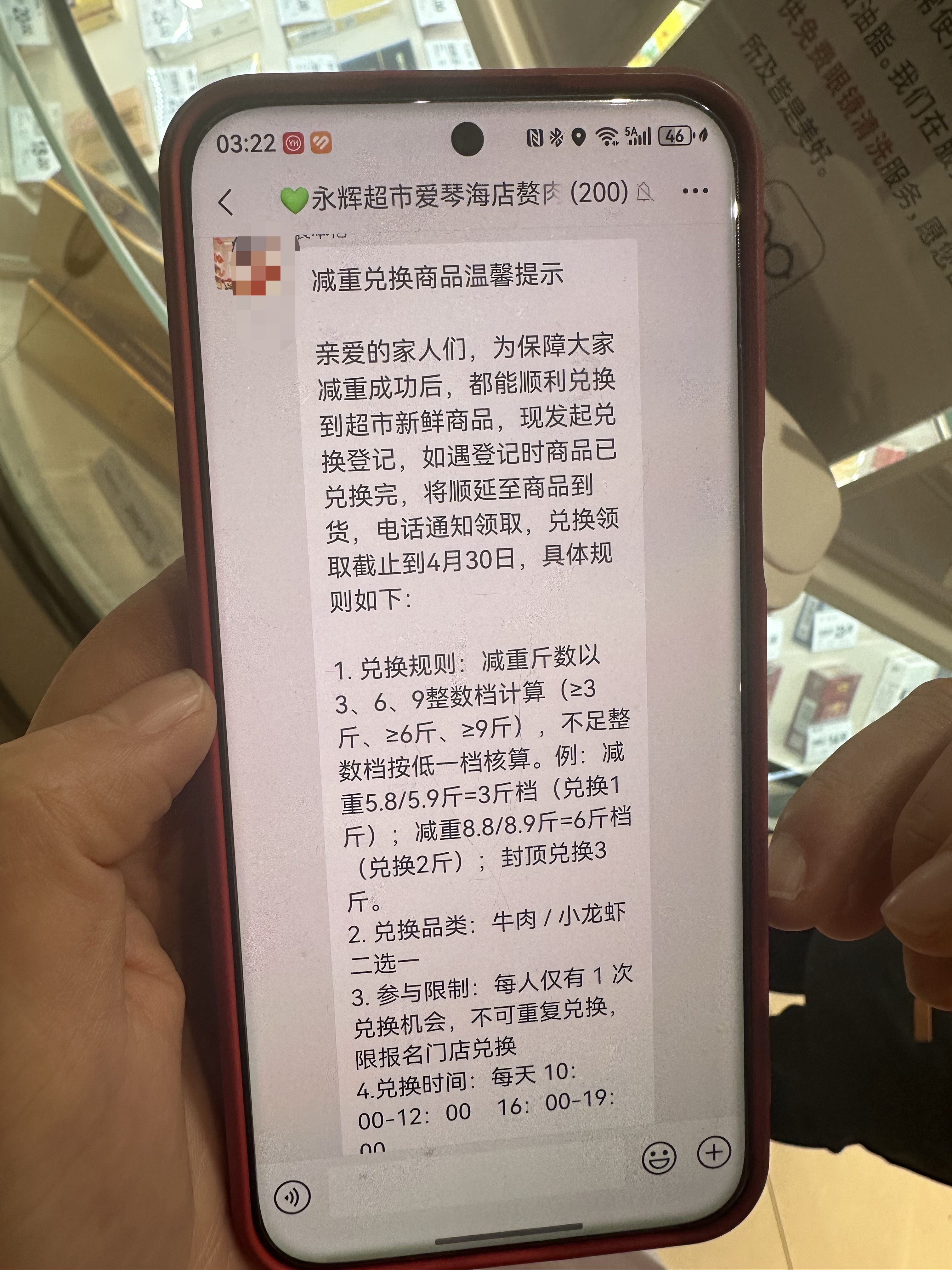 根据活动规则,参与者自报名起10日后凭活动登记卡到店称重兑奖,减重斤数以3、6、9整数档计算,非整数档按低一档核算,最多兑换3斤。每人限制参加1个门店活动,仅有一次参与机会。